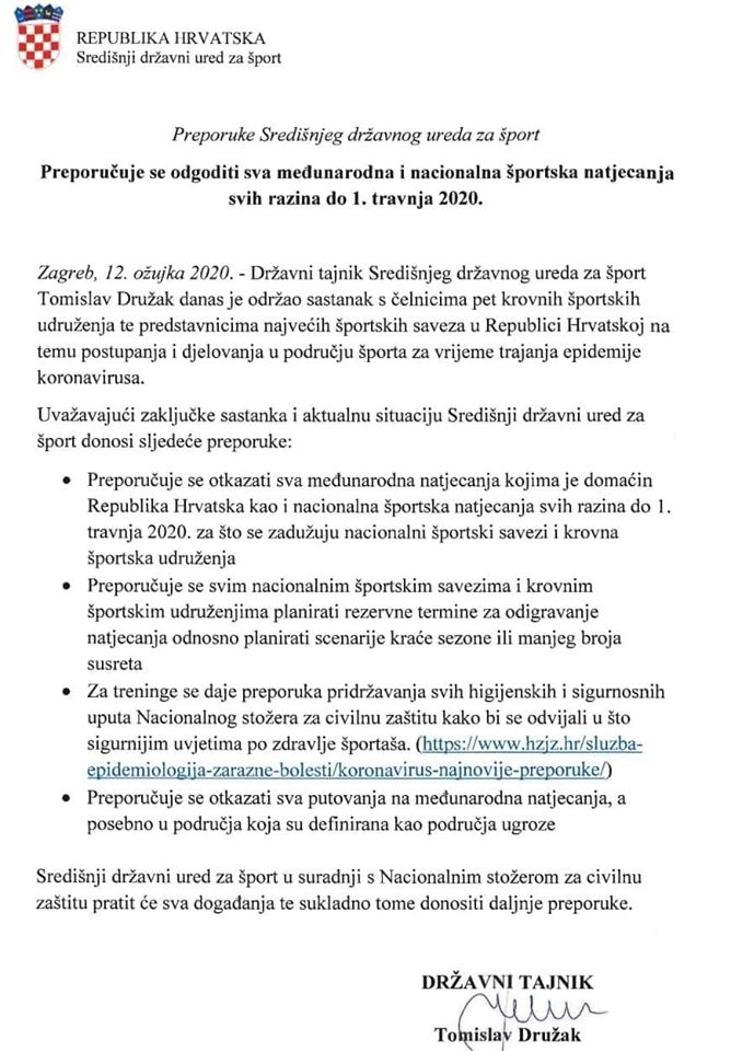 Sukladno Odluci o izmjeni odluke o nužnim mjerama ograničavanja društvenih okupljanja, rada u trgovini, uslužnih djelatnosti i održavanja sportskih i kulturnih održavanja za vrijeme trajanja proglašene epidemije bolesti COVID-19 od 11. svibnja 2020. godine Nacionalanog stožera civilne zaštite RH, kao i preporukama koje je za održavanje treninga i športsko-rekreativnih aktivnosti donio Hrvatski zavod za javno zdravstvo, posebno za rad u zatvorenim prostorima, posebno za rad u otvorenim prostorima: