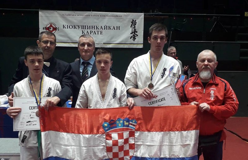 Na slici: Alen, Mateo i Bruno te treneri Sekelj i Fabekovec u društvu shihana Sergeya Lukyanchikova, dopredsjednika europske IKO Matsushima organizacije i ukrajinskog branch chiefa nakon Otvorenog Matsushima kupa Ukrajine 2019.