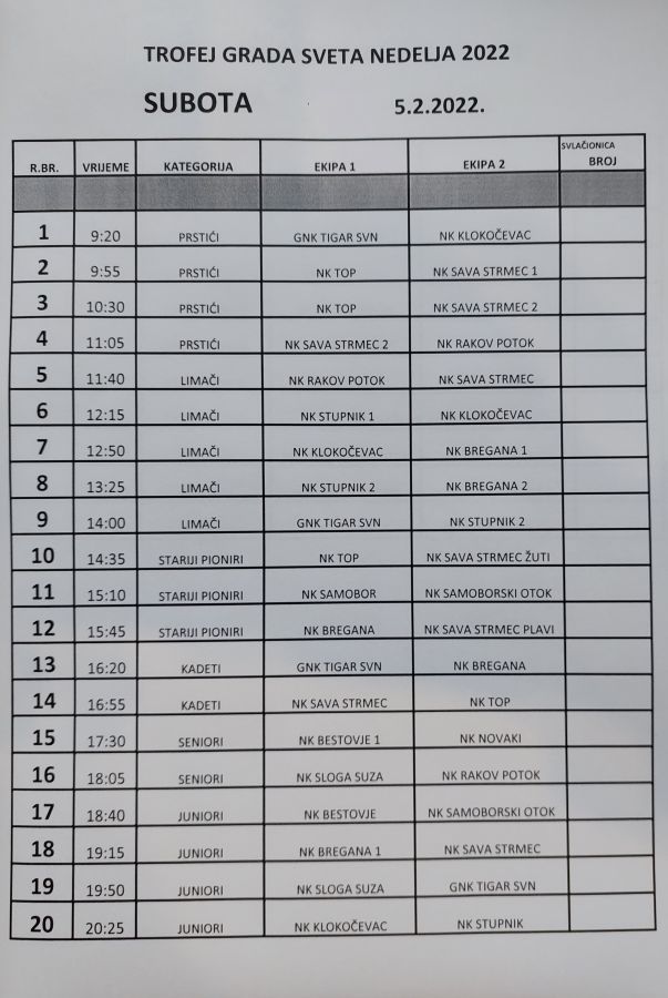 Utakmice će se igrati u dane vikenda (subotom i nedjeljom) sve do 20. veljače 2022. godine, a sudjeluju sve dobne skupine, od minića do veterana. Prijavljeno je sveukupno 60 ekipa iz 13 nogometnih klubova sa područja Svete Nedelje, Samobora i Stupnika.